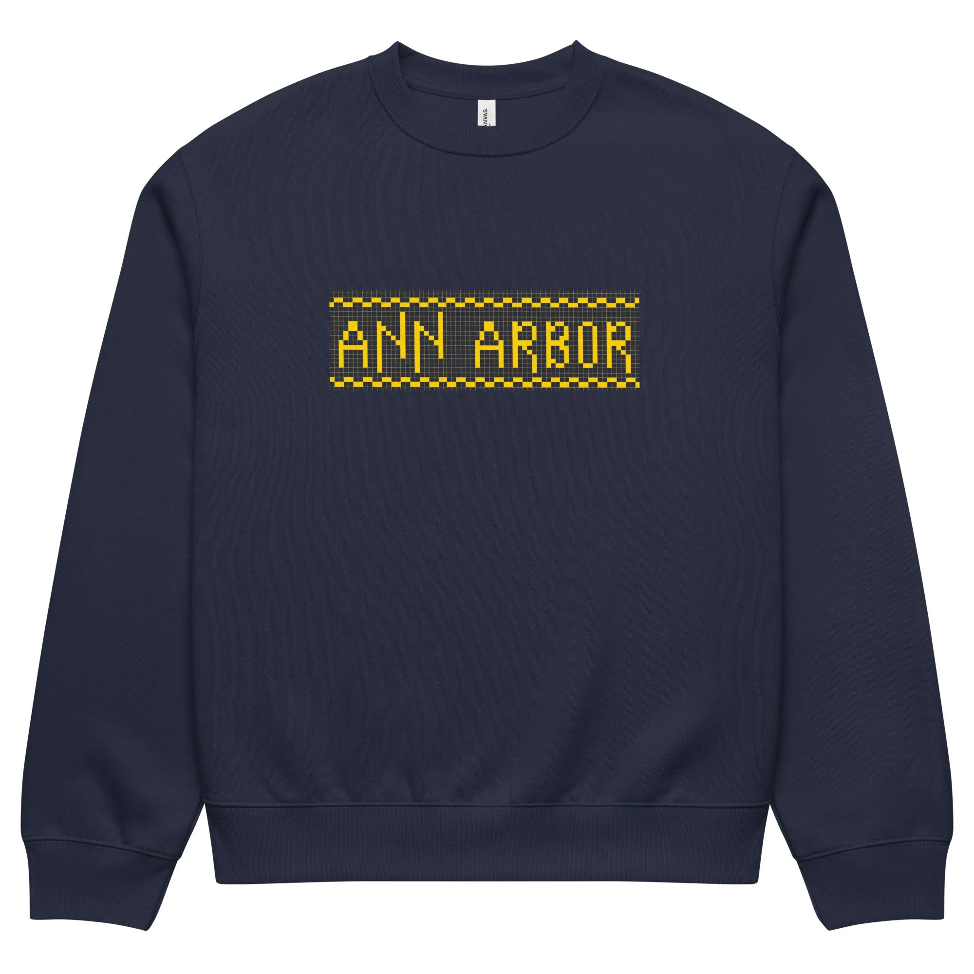Our Ann Arbor design is a nod to the beloved Zingermans, and looks especially right on this heavyweight navy crewneck, where the maize lettering lands with a little more contrast and a little more old-school Michigan energy. It feels collegiate without feeling overly polished, like something that belongs equally on a bench near the Diag, inside Nickels Arcade, or layered up for a chilly afternoon in town.